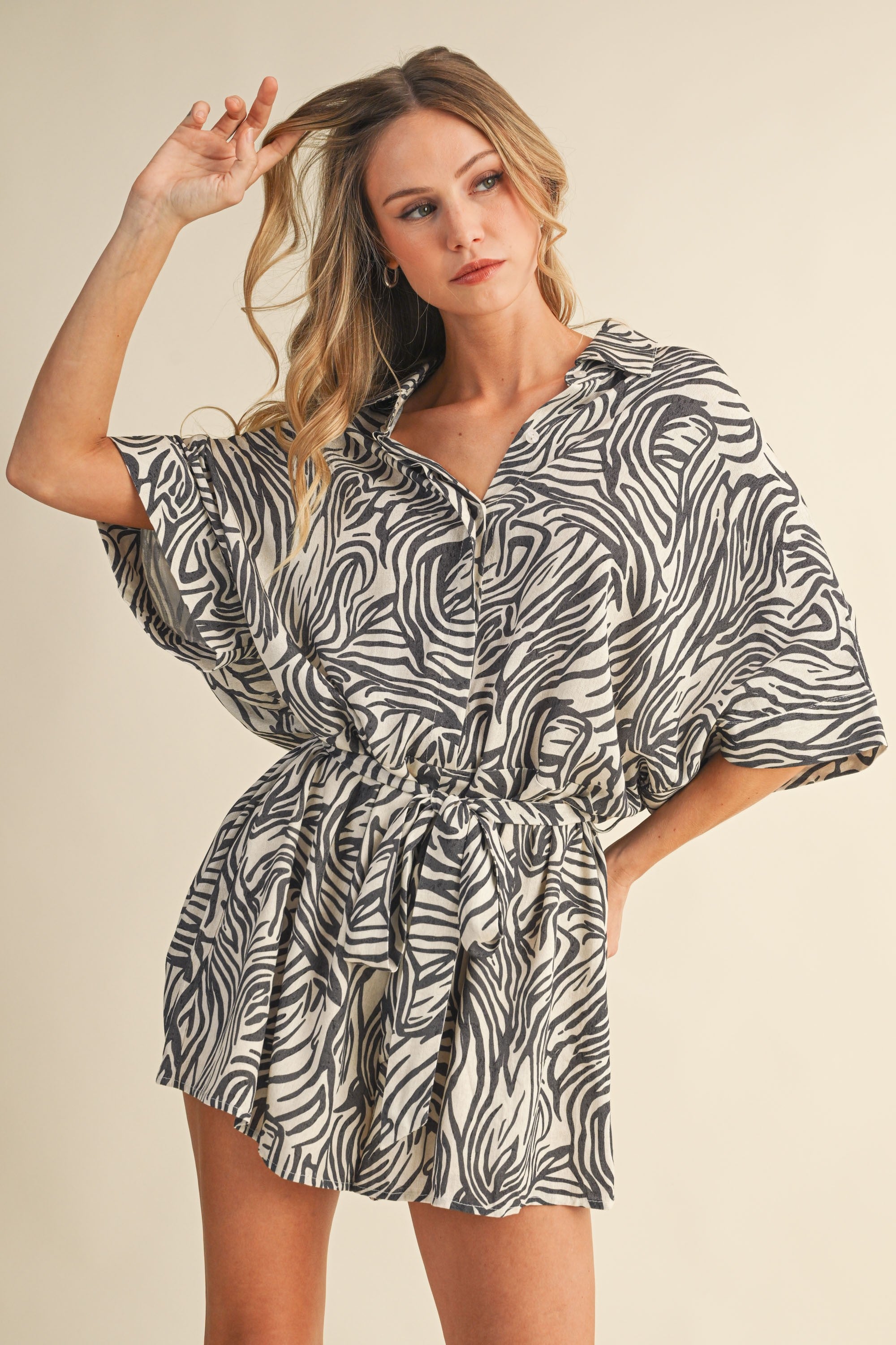 Nami Zebra Print Oversized Shirt Collar Belted Romper