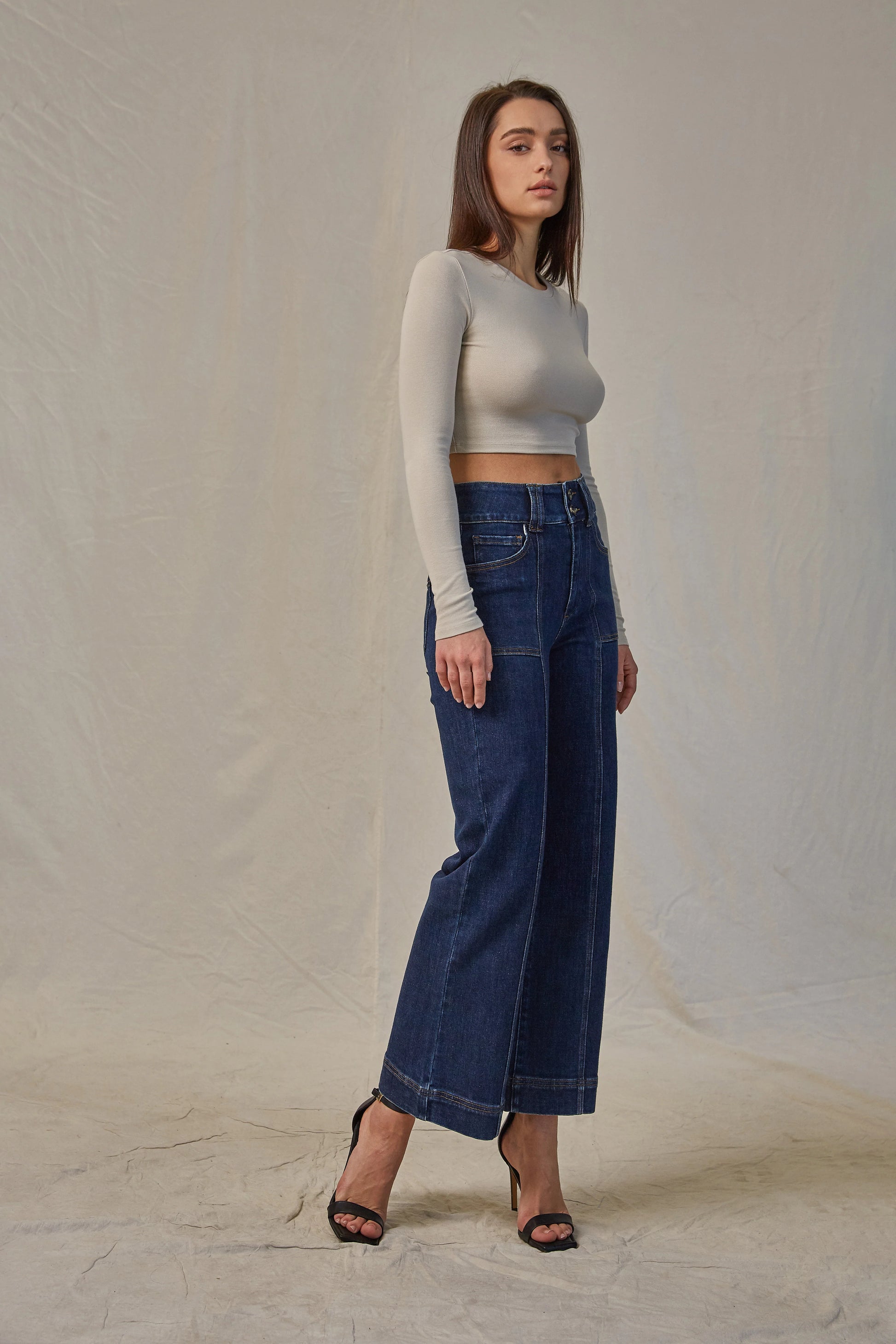 a good pair of denim is a life-changing wardrobe essential. these are full of all outfit possibilities. featuring a super high-rise wide leg crop fit, seam & pocket detailing - these jeans have that ideal look, feel, and the dreamiest stretch.