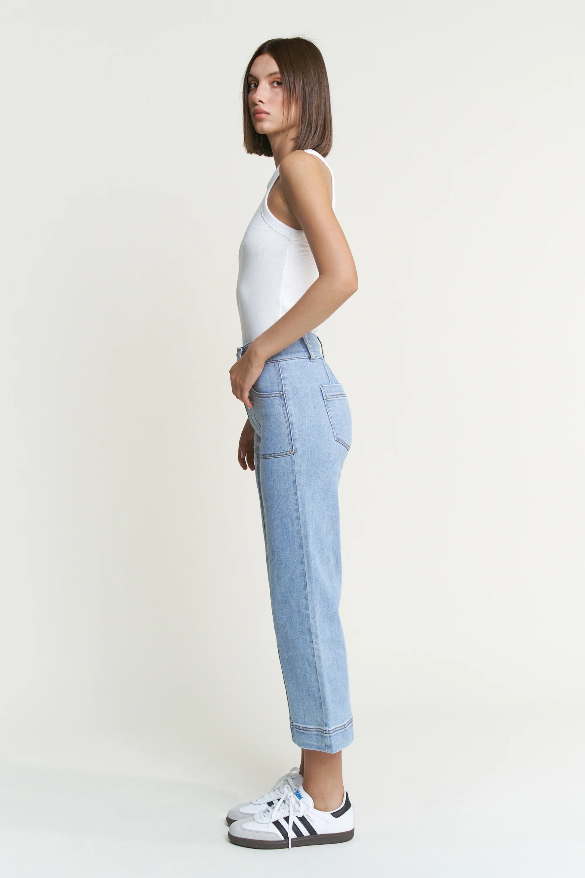- lighter wash, high waisted, cropped wide leg, seam detailing, one button fly zip, pockets, belt loops
